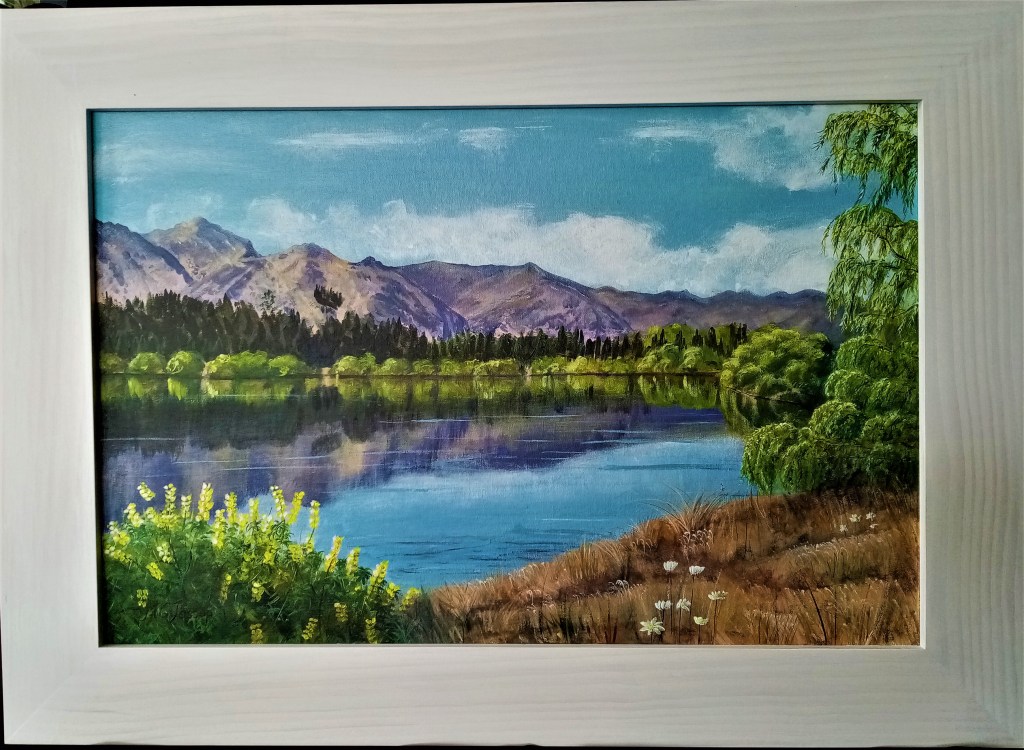 Lake Aviemore NZ. One of NZ’s favorite tourist spots. Acrylic on canvas, framed NZ$950