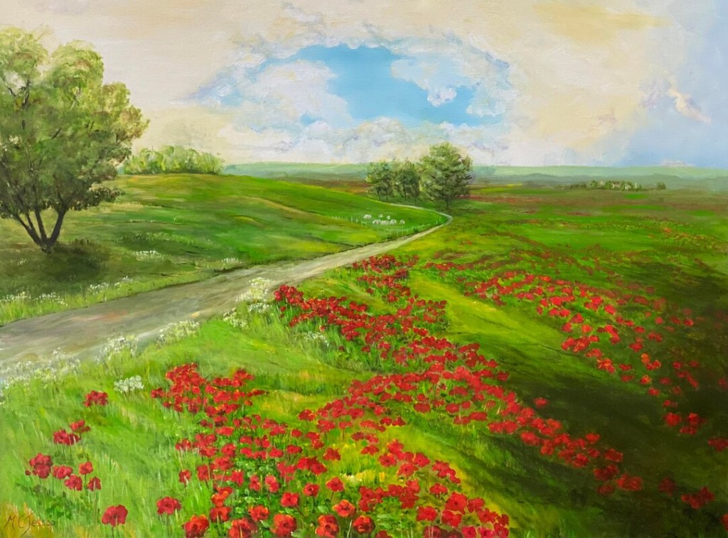 Poppy Road – 760 x 1000mm, acrylic on stretched canvas. Part of my Impressions of Summer Series but not heavily textured. P.O.A.