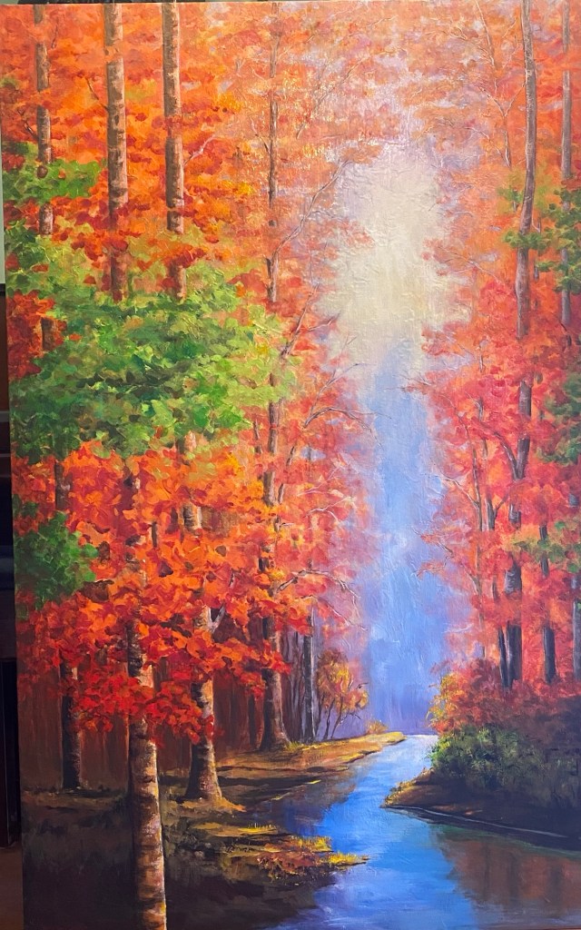 Along the Sunlit Stream (SOLD by Raukura Art Gallery) Ravishing Reds 1200 x 750mm and richly textured. SOLD