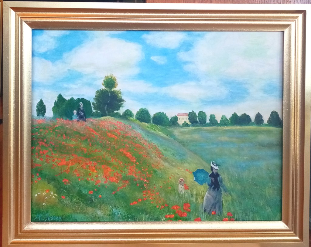SOLD by McAtamney Gallery – The Poppy Field after Claude Monet. This is a remaster of the original. Acrylic on canvas 660 x 810mm including rose gold frame. Monet painted the poppy field near Argenteuil in 1873 when he was living there with his family. The young woman with the sunshade and the child in the foreground is said to be Monet’s wife, Camille and their son Jean.